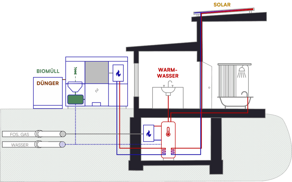 Das Biogas wird aufbereitet, gespeichert und kann dann z.B. zum Kochen oder Heizen verwendet werden. Als Nebenprodukt kann optional auch düngerhaltige Nährlösung für den Garten abgefüllt werden.